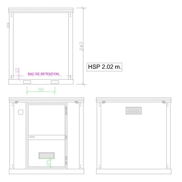 Nuestro bungalow de almacenamiento de productos fitosanitarios dispone de suelo de acero galvanizado con bandeja recogedora rematada con una rejilla de acero galvanizado. La base está reforzada e incluye un paso para horquillas que permite manipular el módulo con una máquina elevadora equipada con horquillas de 250 cm. El módulo está equipado con puerta, dos rejillas de ventilación, neón LED, calefacción y toma de corriente.